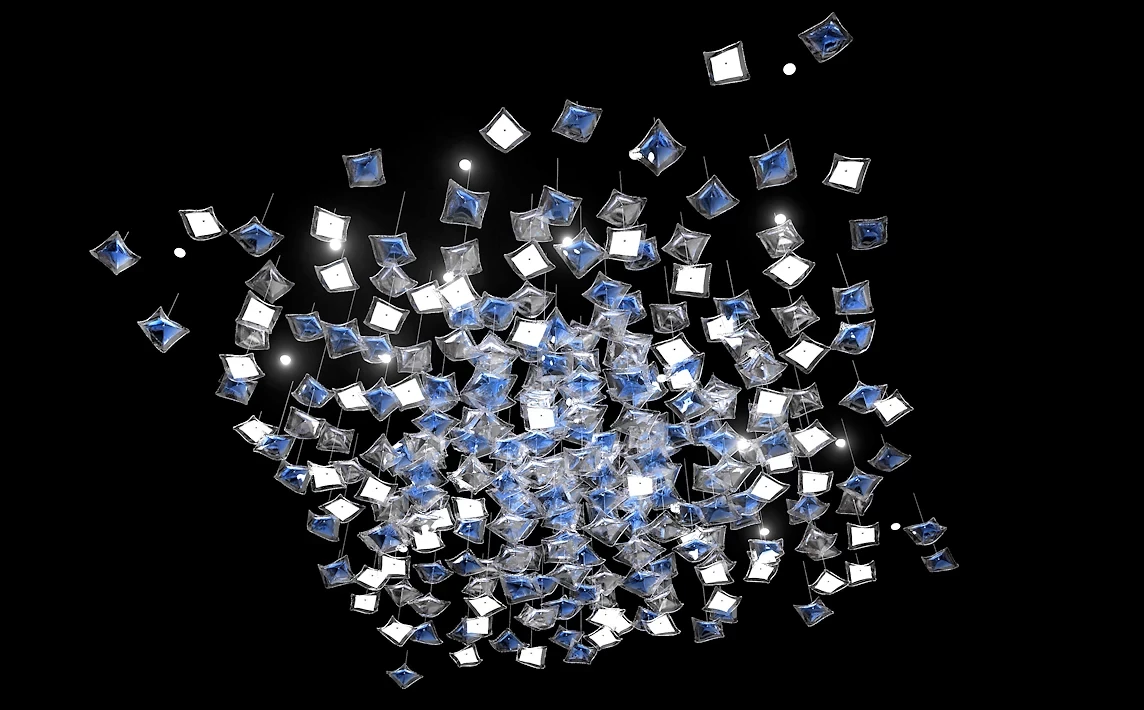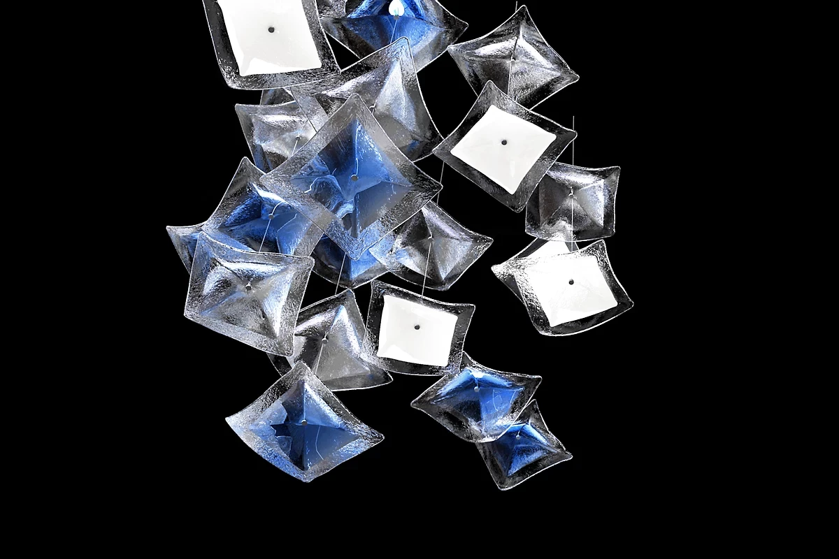 This stunning installation is made of rectangular blown‑glass components resembling tiny, scattered pieces of cloth. This bespoke item triumphs in areas with lower ceilings.