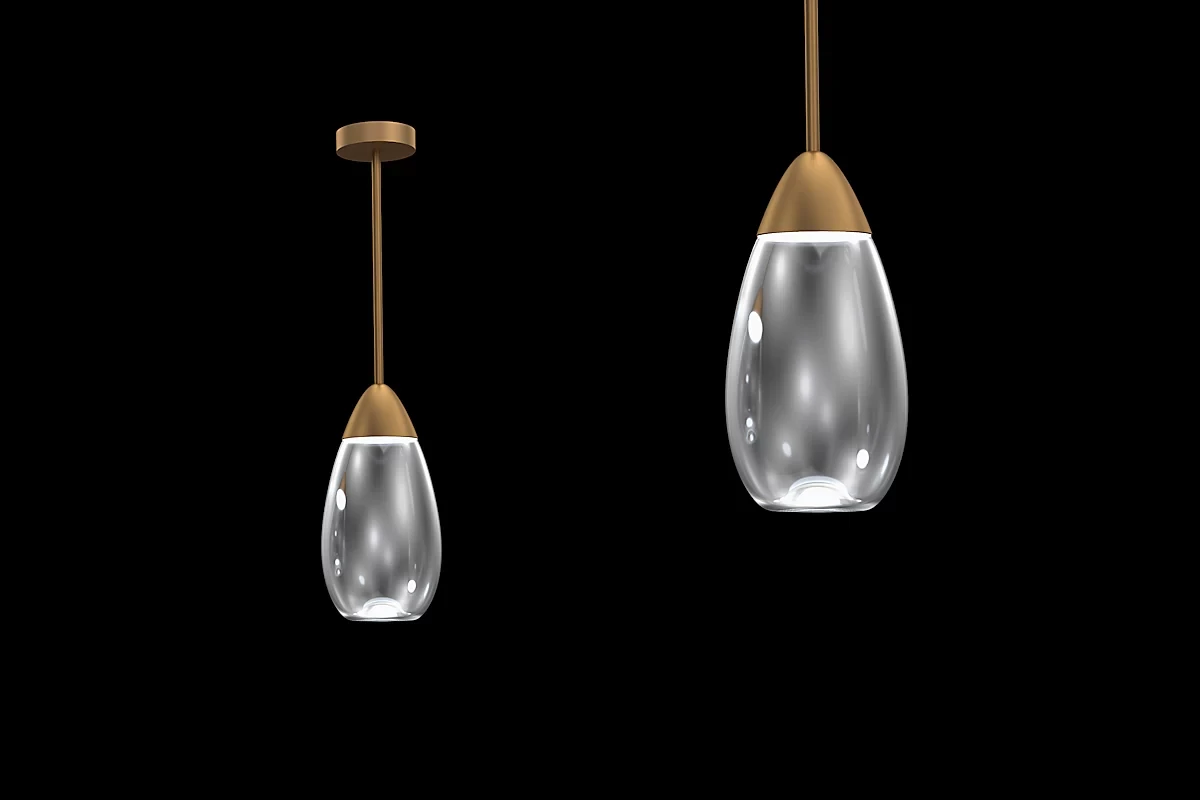 The fixture is available in two versions, each with distinct proportions. The diffused light delicately illuminates the clear glass shade, casting a warm and inviting glow that enhances the ambiance of your room while producing a generous amount of functional light. The shade is suspended from a tube. Thanks to its utilization of LED technology, the light source is both efficient and maintenance‑free.