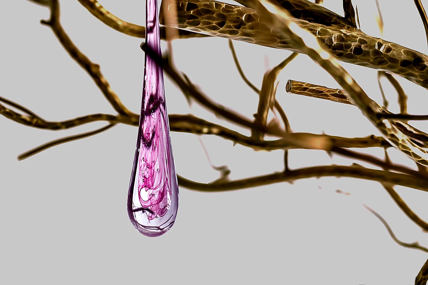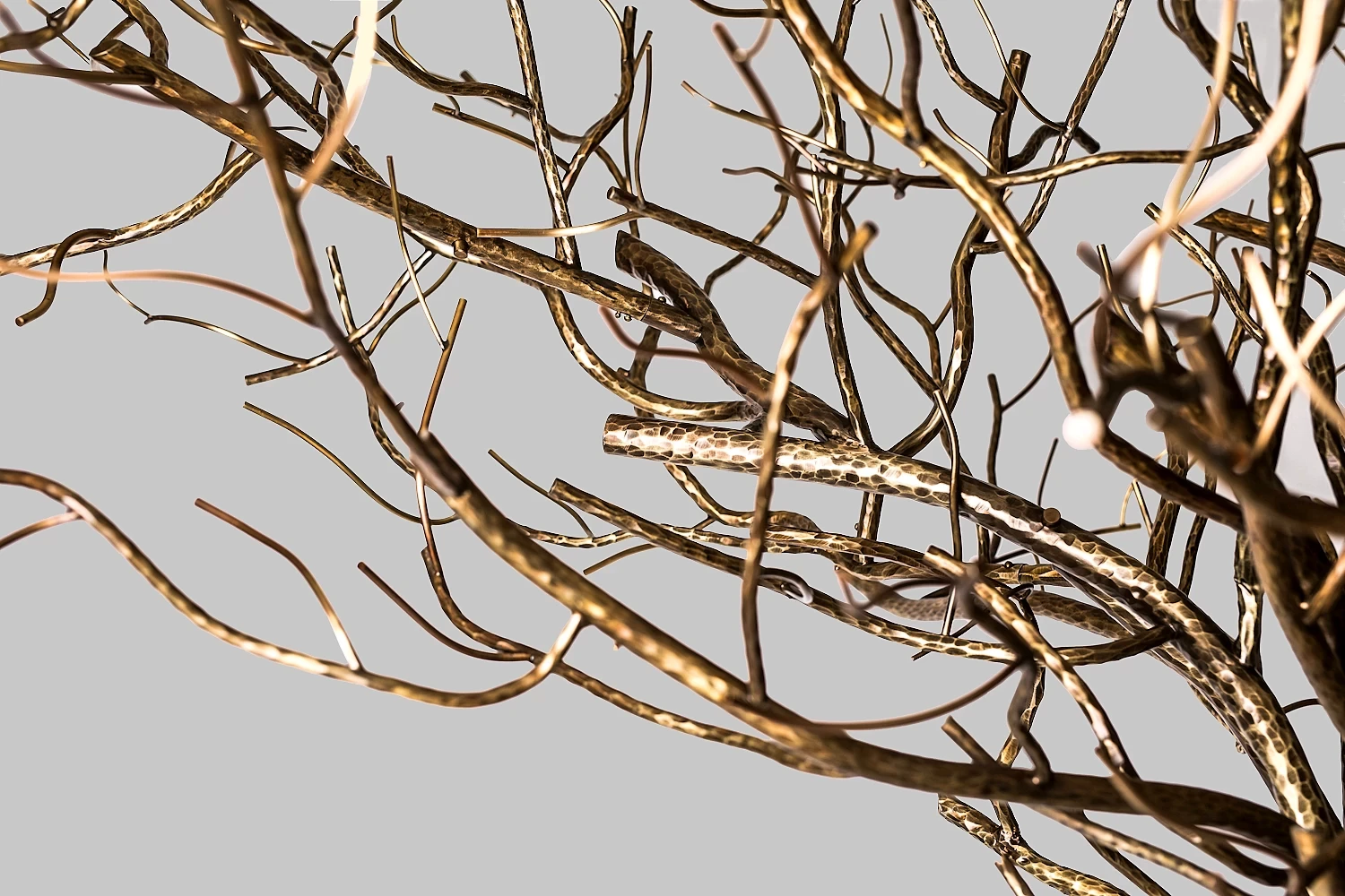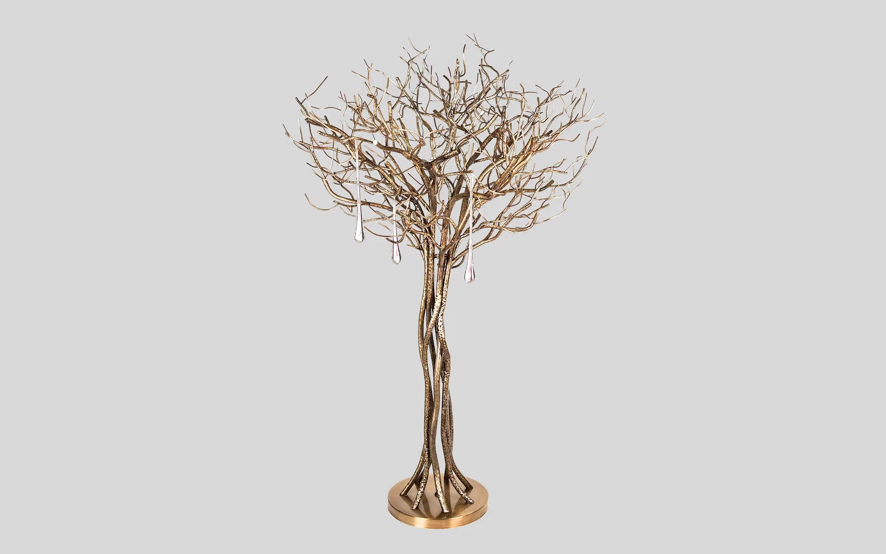 Handmade in solid brass, this beautiful sculpture is over two metres tall and is adorned with hand-blown glass droplets.